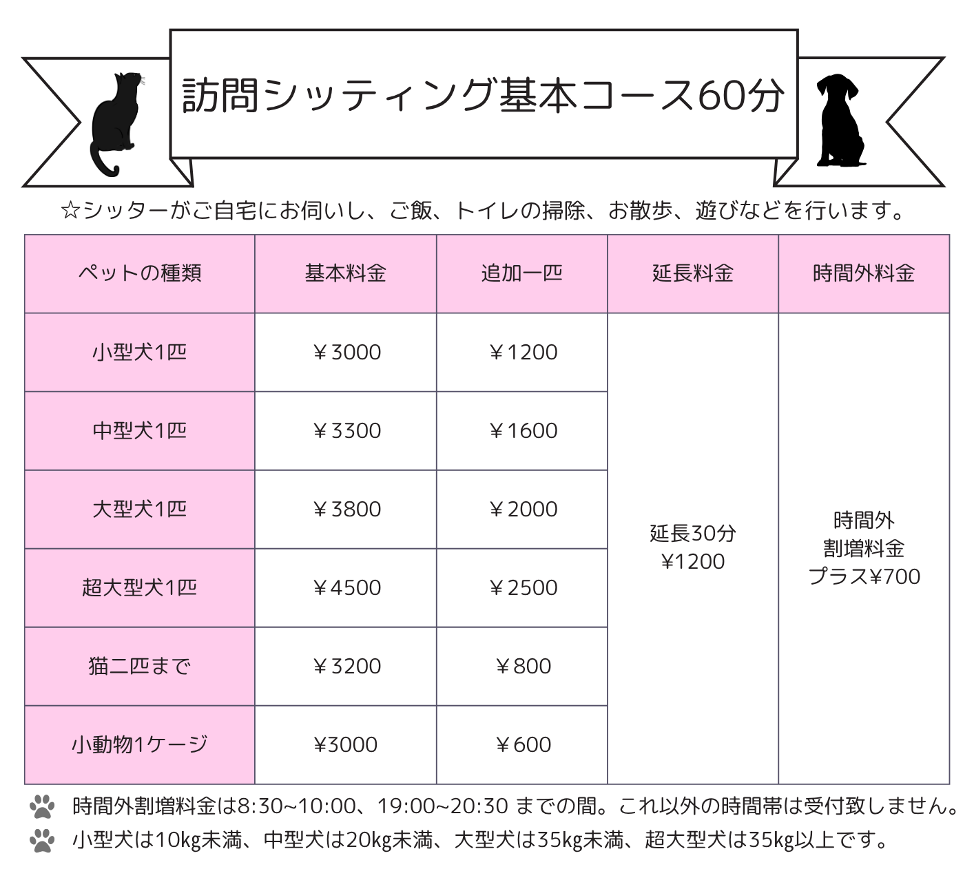 - 訪問シッティングに関しては、事前打ち合わせ、ペットのご状況などを拝見するため、シッティングご訪問日の最低でも1週間前までにはご連絡下さい。
