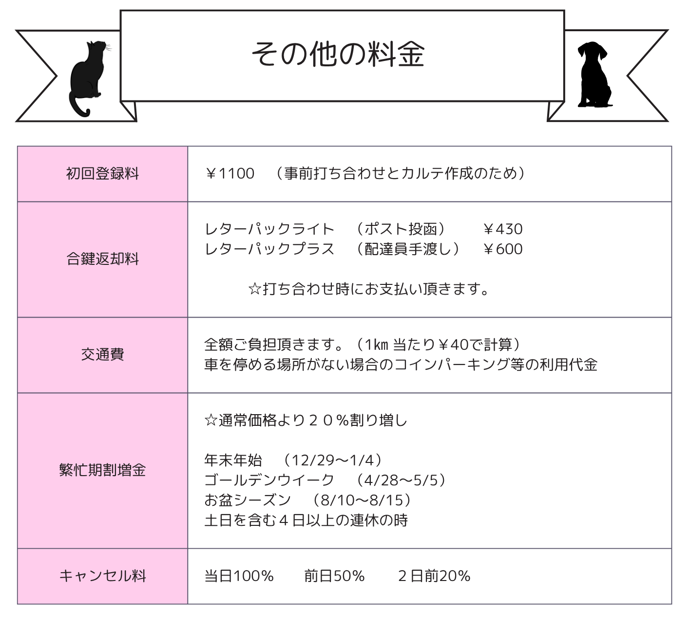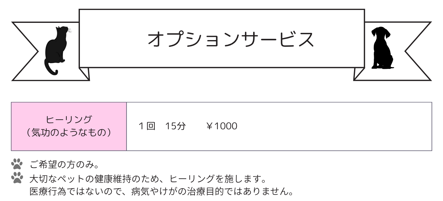 - 飼い主様と連絡がつかない場合、こちらのかかりつけの獣医に判断をあおぎ、獣医にかかる場合もございます。その際の医療費も後日請求させて頂きますので、ご了承下さい。